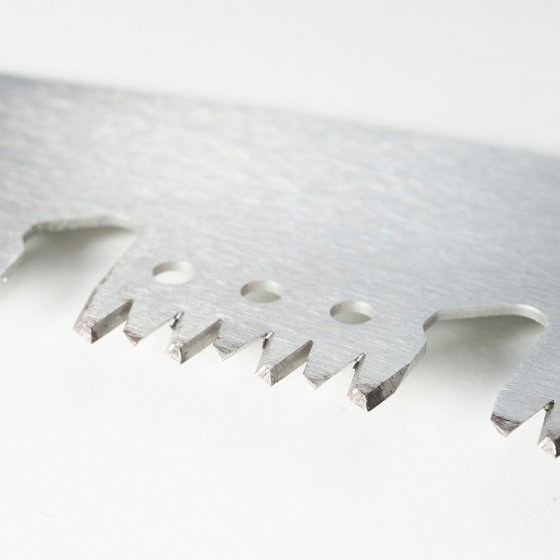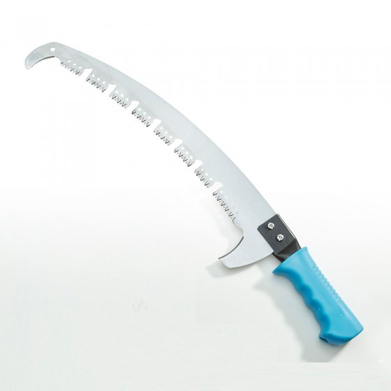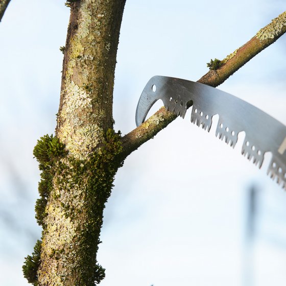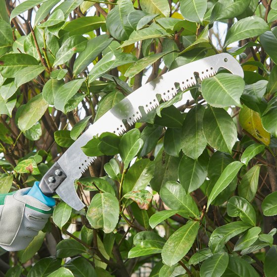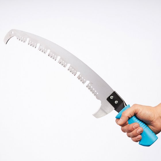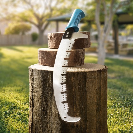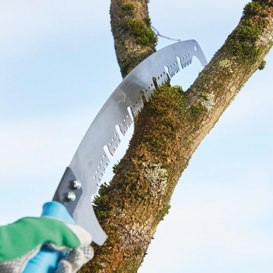 Les arbres fruitiers et décoratifs ont besoin d'une coupe régulière – pas seulement pour les embellir, mais aussi pour favoriser la floraison et la production de fruits. La SCIE D'ÉLAGAGE EN ACIER AVEC COUPE-BRANCHES est idéale pour ce travail : grâce à sa forme légèrement incurvée et à sa denture trapézoïdale, elle pénètre dans le bois « comme dans du beurre ». Les espaces entre les dents empêchent l'accumulation de copeaux, ce qui permet de scier les branches trois fois plus vite qu'avec une scie égoïne. Deux coupe-branches à chaque extrémité de lame servent à peaufiner la coupe. Dimensions poignée incluse (L x l x H) : env. 58 x 12 x 3 cm. Difficile de trouver mieux pour ménager ses forces et son temps en coupant des branches !