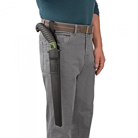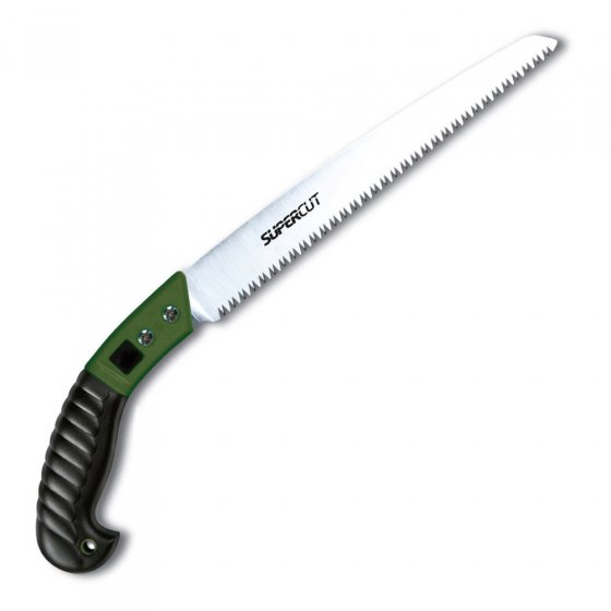Deux caractéristiques permettent de reconnaître une scie de qualité : une lame robuste et un manche sûr. La lame de notre SCIE DE JARDINAGE professionnelle est extrêmement stable : en acier de carbone résistant à la rouille et revêtu de chrome dur, ses dents ont fait l'objet d'un durcissement par impulsions. Aucun type de bois n'y résiste ! Le "manche pistolet" est on ne peut plus sûr : il possède un revêtement en caoutchouc assurant un excellent maintien, même en cas de mains humides. Un étui en plastique à fixer à la ceinture permet de protéger la lame. Longueur totale de la scie : env. 48 cm. Pas de double tranchant avec cette scie !