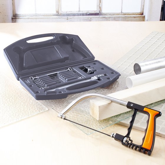 Bois, métal, plastique, caoutchouc, céramique - cette scie polyvalente convient parfaitement pour de nombreux travaux de bricolage, de réparation et de jardinage. Elle permet de scier les étagères, les plinthes, les tringles à rideaux, les tuyaux d'écoulement, les miroirs, les carreaux et même les branches d'arbres. Désormais, vous pouvez réussir facilement tous ces travaux grâce à la SCIE MAGIQUE, livrée dans sa mallette de rangement pratique et peu encombrante. Servez-vous des quatre lames interchangeables de coupe fine (orientables sur trois positions) pour le métal et le plastique. Avec la plus grande lame, vous pouvez utiliser la scie comme une égoïne pour la coupe de bois divers et l'élagage. Les deux inserts de lame diamant redonnent leur tranchant à vos outils de coupe. La pointe en carbure de tungstène sert à tracer des lignes de coupe sur le verre, les miroirs et les carreaux. Ensuite, vous pouvez vous servir des encoches pratiquées sur la partie inférieure de la scie pour tenir le matériau et le couper le long de la ligne tracée sans risque de vous blesser. Vous avez ainsi tous les matériaux bien en main, même les plus durs. Le manche de forme ergonomique tient bien dans la main. Les deux mèches s'utilisent pour le perçage préalable de trous. Avec cette scie, vous obtiendrez toujours de bons résultats, dedans comme dehors.