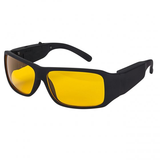 behoeften. Daarnaast zorgen de geel-getinte glazen voor een verbeterd contrast en schittering te reduceren. Frame gemaakt van slagvast kunststof, onbreekbaar acrylglas, uit-schakelaar voor de alarmfunctie. Werkt op knoopcellen (inbegrepen). Met opbergkoffer. Intelligente waarschuwing bril die aan uw gevoel van veiligheid bij draagt aan het stuur!