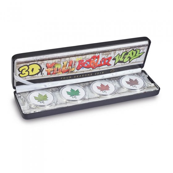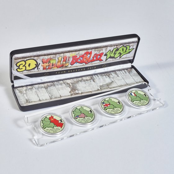 Kostbare verzamelobjecten: de gelimiteerde SET ZILVEREN MUNTEN '30 JAAR VAL VAN DE MUUR', bestaand uit 4 Canadese 5-dollarmunten, is een herinnering aan een van de gedenkwaardigste evenementen in de geschiedenis van Duitsland. Elk van de 4 Maple Leafs is aan de achterzijde voorzien van de contouren van de betreffende geallieerde sectoren en aan de achterzijde van het karakteristieke ahornblad. Beide kanten van de munt zijn gekleurd. Legering: zilver van de hoogste zuiverheid (999,9/1000). Wordt geleverd in een cassette met grafisch vormgegeven certificaat van echtheid, de munten daarin zijn afzonderlijk gekapseld. Afmetingen elk munt: Ø ca. 38 mm. Deze buitengewone muntenset is niet alleen een must voor alle verzamelaars, maar is ook een waardevaste belegging.