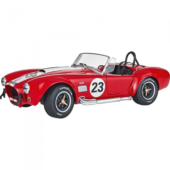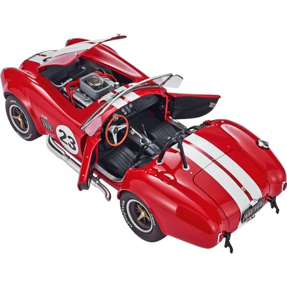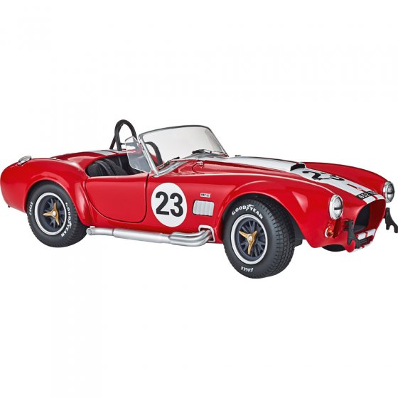 Si vous connaissez l'origine de l'AC Cobra, vous savez que cette voiture est un véritable bolide : en 1961, le coureur américain Carroll Shelby a eu l'idée de placer dans une petite Roadster Ace anglaise un gigantesque moteur de Ford V8 amélioré. Et voilà le résultat ! Le cadre et les freins ont été renforcés et les garde-boue élargis pour obtenir la célèbre forme musclée que nous connaissons. La Cobra a battu de nombreux records de vitesse et a fait son entrée dans le Guiness des records en 1965, en tant que voiture de route la plus rapide. La version de course de la SHELBY COBRA 427 avec son puissant moteur V8 7 litres et ses 435 chevaux est désormais disponible en miniature à l'échelle 1:18 en zinc moulé sous pression. Avec ses portes et son capot qui s'ouvrent, elle attirera tous les regards dans votre vitrine. Longueur : env. 21 cm. Direction véritable. La nouvelle star d'une collection digne de ce nom !