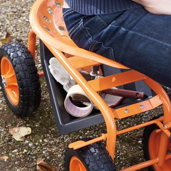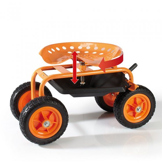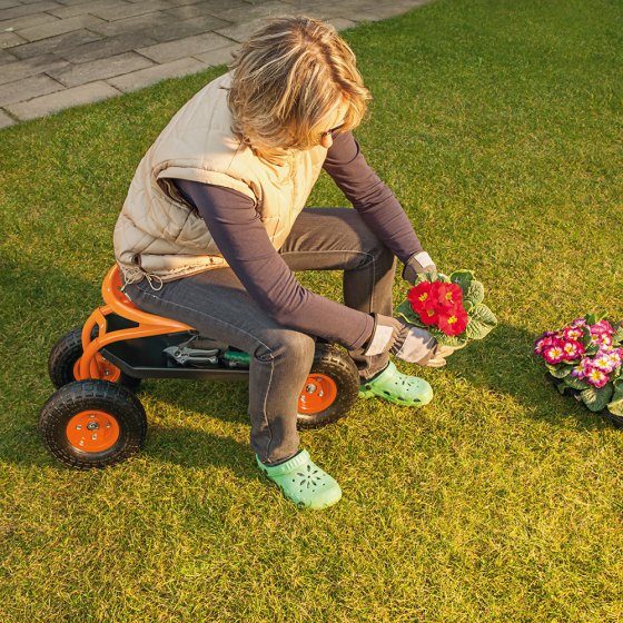 Vous aimez travailler au jardin ? Grâce à ce SIÈGE DE TRAVAIL ROULANT AVEC FREIN, plus besoin de vous baisser ou de faire des efforts inutiles – même sur un terrain pentu ! La large assise de forme ergonomique est réglable en hauteur et entièrement pivotante, afin de pouvoir travailler confortablement tout autour de vous. Grâce à la fonction pratique de freinage, vous pouvez facilement bloquer les roues tout-terrain (Ø : env. 25 cm) pendant le travail - pour éviter tout déplacement inopiné. Vous pouvez également travailler confortablement et en toute sécurité sur des pentes ou dans des allées raides jusqu’à 15 degrés. Dimensions (L x l x H) : env. 81 x 44 x 54 cm. Version solide en métal. Avec rangement sous le siège. Profitez pleinement de votre jardin en vous facilitant la tâche !