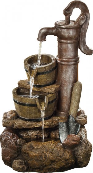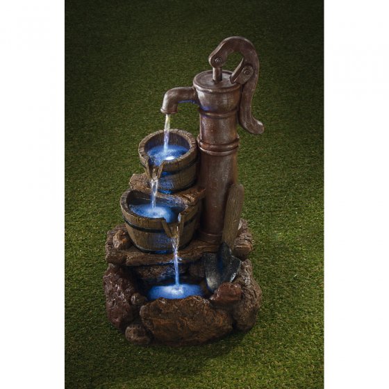 Zo rustiek en natuurgetrouw kan men het zich slechts wensen: De SIERFONTEIN MET LED-VERLICHTING is een kopie van een nostalgische zwengelpomp met watertroggen. Zoals bij de cascaden, klatert het water in een constant rustgevend stroompje naar beneden – een mooi gezicht! Drie blauwwitte led’s toveren bovendien schitterende lichtjes op het water. Tegelijkertijd houdt een sterke maar stille pomp het water in beweging – en zorgt zo voor eeuwigdurend genot! Afm.: ca. 45 x 38 x 75 cm. Met aan-/uitschakelaar en 10m kabel. Gewoon neerzetten, in het stopcontact steken – en plezier hebben! Kwalitatieve, zeer authentieke versie van weerbestendig kunststeen (polyresin). Een uitzonderlijk mooie decoratie voor tuin en terras. "Waar heb je dat unieke exemplaar vandaan?", zullen uw gasten vragen. Of u het verklapt, ligt geheel aan u.