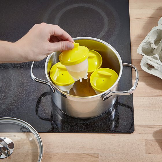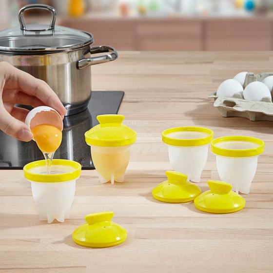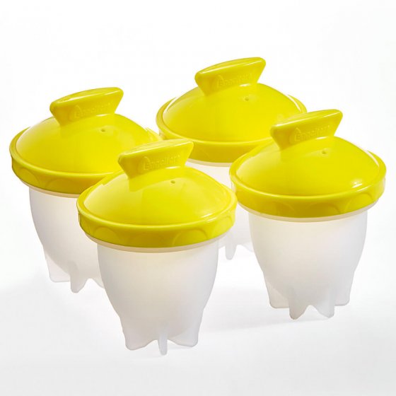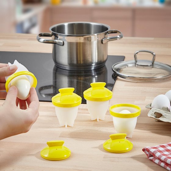 Houdt u van eieren bij het ontbijt? Wat dacht u van een nieuwe variant, een waarbij u niet alleen niet hoeft te pellen, maar ook interessante kruidenmixen kunt uitproberen? Doe in elk van de SILICONE-EIERKOOKVORMEN 'EGGCITERS®' een rauw ei, kruid deze naar wens, sluit elke vorm met de bijbehorende kunststof deksel en kook de gevulde houders in een pan met water. Druk vervolgens de eieren uit de vorm en u hebt een hardgekookt ei zonder schil. Afmetingen elke vorm (Ø x H): ca. 7 x 9 cm. Na gebruik kunt u de vormen en de deksels gewoon in de vaatwasser doen. Geniet met Pasen van bijzondere eieren bij het ontbijt.