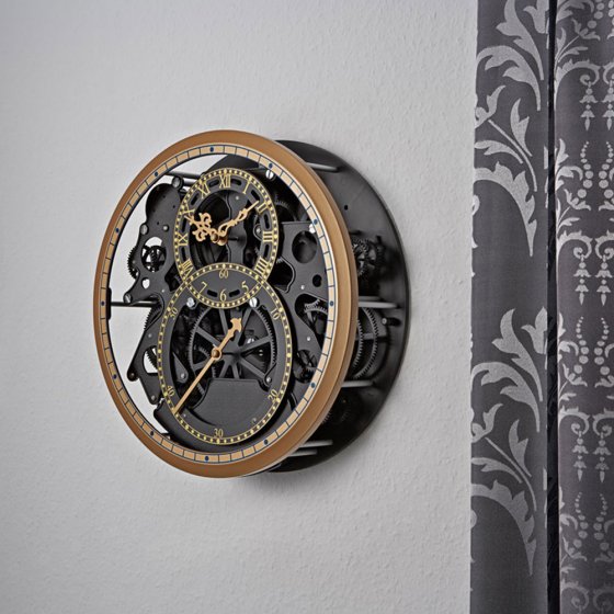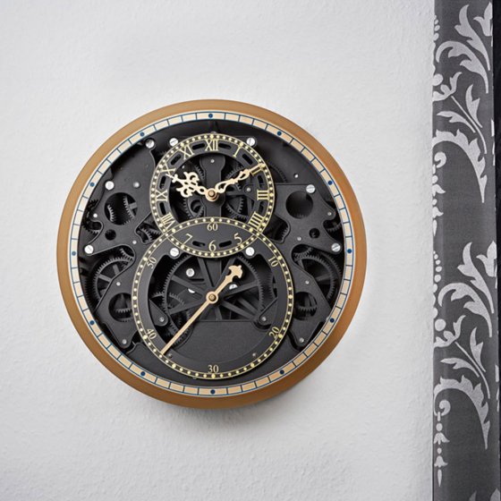 Mechanische uurwerken behoren helemaal tot de meest fascinerende apparatuur: de in elkaar grijpende tandwielen trekken elke toeschouwer in hun ban. In het SKELET HORLOGE "ZWART EN GOUD" is de fijnste mechanische interactie bijzonder goed te zien, vanwege de secondenweergave, is er een extra grote wijzerplaat. Uren en minuten worden weergegeven op de kleinere wijzerplaat (met Romeinse cijfers). Materiaal: Metaal en ABS kunststof. Werking: Quarts (werkt op 2 C-batterijen, apart verkrijgbaar). Afmetingen: Ø ca. 35 cm, diepte huisvesting ca. 10,5 cm. U wilde altijd al graag zien, hoe de tijd voort schrijdt? Deze horloge laat het u precies zien!