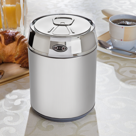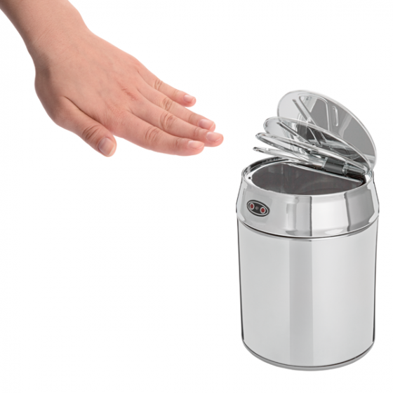 Geen lastig hanteren meer met klapdeksels, geen vuile handen, noch vlekken en spatten op de tafel! Deze AFVALBAK MET SENSOR voor op tafel draagt veel tot een hygiënische omgeving bij en maakt het alledaagse leven iets dragelijker. Dankzij een topmoderne infrarood sensor gaat hij, zodra uw hand op ca. 15 cm afstand van het deksel komt, automatisch open. Trekt u de hand weer weg, gaat hij na 5 seconden automatisch weer dicht. Tissues, etens- en fruitresten, snoeppapier, enz. gewoon - in deze privé minivuilniskoker laten vallen zonder 'm aan te raken. Van kwalitatief hoogwaardig edelstaal. Inhoudsvermogen 1,5 l. Afmeting: ca. 12 x 12 x 15 cm. Door losse binnenemmer makkelijk leeg en schoon te maken. Werkt op 3 AAA batterijen. (apart verkrijgbaar) Een prachtige uitvinding, die comfort, hygiëne en attractieve optiek verenigt.