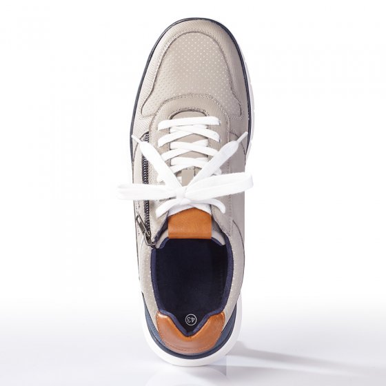 Vermoeide voeten na een lange dag? Dat is verleden tijd met deze SNEAKERS MET RITSSLUITING. De slechts 260 g lichte schoen van polyurethaan (bovenwerk) en microvezel (voering) is met de vetersluiting geheel naar wens aan te passen. Vervolgens kunt u dankzij de ritssluiting opzij de schoenen gemakkelijk aan- en uittrekken. Tong en schachtrand zijn zacht verdikt. De kunststof antislipzool is flexibel. Zo kan de voet veilig afrollen. Bijzonder chic is het sportieve accent door contrasten!