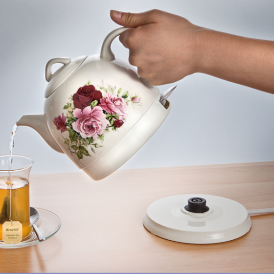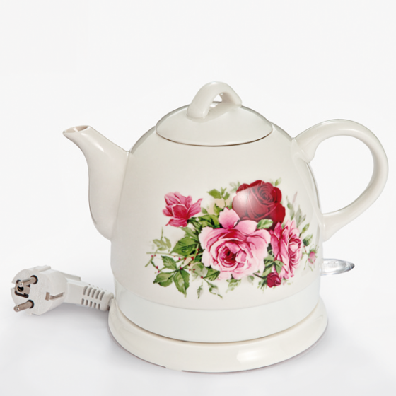 De meeste waterkokers van kunststof of plastic werken weliswaar goed, maar echt mooi zijn ze meestal niet! Heel anders is dat bij deze chique SNOERLOZE KERAMISCHE WATERKOKER in klassieke theepotvorm met bloemendecoratie. Deze waterkoker vervult zijn taak op elegante wijze – en slaat zo ook op tafel een goed figuur! Werkt op 230 V, met 360° draaibaar verwarmingsstation en verborgen verwarmingselement. Inhoud ca. 800 ml, 1400 W, afmetingen ca. 22 x 16 x 18 cm. Inclusief automatische kookstop. Met deze waterkoker, die vorm en functionaliteit op fraaie wijze verenigt, kunt u zich verheugen op uw volgende „tea time“.