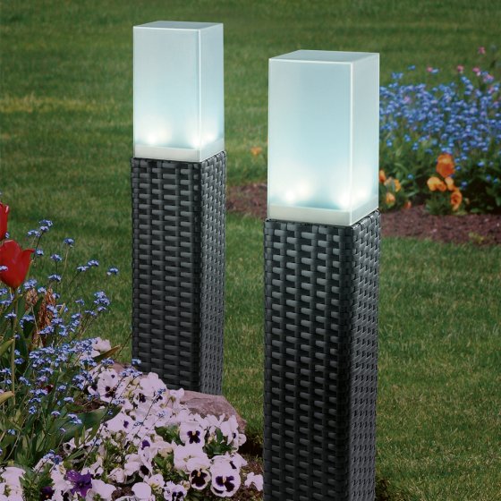 Des colonnes lumineuses dans un jardin ou sur une terrasse sont extrêmement décoratives – en particulier quand elles sont assorties aux meubles de jardin. Ces LAMPES SOLAIRES ROTIN, résistantes aux intempéries et fabriquées dans une imitation de rotin très réaliste, viennent compléter à merveille votre salon de jardin en rotin ou vos assises en osier ! Ces colonnes, toutes équipées de 4 LED et d’un panneau solaire invisible de l’extérieur avec batterie, vous assurent un éclairage plein d’ambiance pour les douces soirées d’été . Durée de l’éclairage : jusqu’à 8 heures. L’allumage s’effectue automatiquement par capteur de lumière ou manuellement. Fixation par piquet de terre (env. 10 cm). Dim. (L x l x h, sans le piquet de terre) : env. 9 x 9 x 50 cm. Une alliance réussie de lumière et d’élégance !