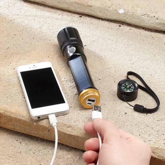 Deze innovatieve SOLAR-USB-ZAKLAMP haalt zijn laadstroom uit het omgevingslicht: leg de lamp met geïntegreerd zonnepaneel voor het opladen gewoon in het licht, dat is alles. De Li-ionaccu van de lamp is via USB op te laden (oplaadkabel meegeleverd). De robuuste behuizing van aluminium is stootvast en waterdicht. De lamp schijnt met een krachtige 500 lumen en is dankzij de USB-aansluiting ook als powerbank te gebruiken. Met 3 lichtprogramma’s (high, low, stroboscoop) en zoomfunctie. Afmetingen (ø x l): ca. 4 x 20 cm. Bent u het zat om voortdurend batterijen voor alle mogelijke apparaten te moeten kopen? Deze zaklamp heeft er geen een nodig.