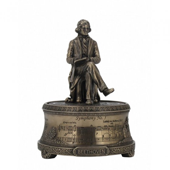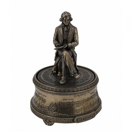 Virtuoos en uitzonderlijk componist: Ludwig van Beethoven en zijn beroemde 5e symfonie bepalen tot op de dag van vandaag de muziekgeschiedenis. Naar aanleiding van zijn 250e verjaardag wordt dit gebronsde SPEELDOOSJE 'BEETHOVEN' een muzikaal gedenkteken in de woonkamer! Het zeer gedetailleerd verwerkte beeld toont Beethoven tijdens het schrijven van zijn prachtige composities en is met de hand te draaien – tegelijkertijd weerklinkt de wereldberoemde en noodlottige 'Symphonie Nr. 5'. De eveneens met de hand gebronsde voet is voorzien van de beroemde noten van de componist en zijn naam. Afmetingen (h / Ø): ca. 15 x 11 cm. Hoogwaardige vervaardiging van resine. Tijdloos mooi!