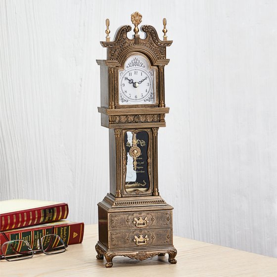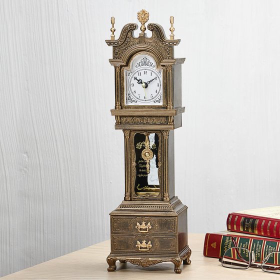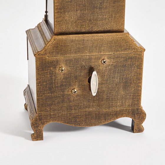 Een staande klok hoeft geen enorm hoog meubel te zijn: dit SPEELDOOSJE 'STAANDE KLOK' is slechts 40 cm groot, maar staat prachtig in elke kast en op elk dressoir. Wat niet is te zien: in de kunststof behuizing met antieke buitenkant bevindt zich een speeldoosje, dat aan de achterkant van de klok is op te winden. Wanneer men de bovenste lade aan de voorkant opent, dan klinkt de Lorelei-melodie. Ook de onderste lade kan open. In beide laden kun je spulletjes opbergen, zoals bijvoorbeeld sieraden. De klok zelf is elektrisch en werkt op een AA-batterij (afzonderlijk te bestellen). Afmetingen (l x b x h): ca. 9 x 12 x 38 cm. Een grootste klok in miniformaat.