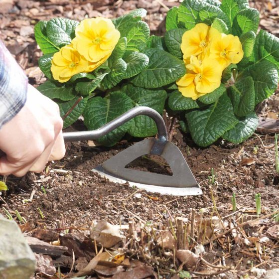 Onkruid uit bloem- of kruidenperken trekken is eigenlijk een vervelend klusje. Tenzij u de STALEN ONKRUIDHAK gebruikt. Met dit ingenieus ontworpen gereedschap komt u niet alleen veel sneller vooruit dan met een tuinmes of schop, maar u 'vangt' ook veel meer wortelvezels. Dit komt doordat het blad een gat heeft, zodat de schoffel als een eg door de grond getrokken kan worden. Als u niet op uw knieën wilt werken, kunt u een lange steel (niet meegeleverd) in het handvat steken en comfortabel staand onkruid wieden. Afmetingen (l x b x h): ca. 33 x 16 x 11 cm. Materiaal: roestvrij staal. Zo komt u moeiteloos van uw onkruid af!