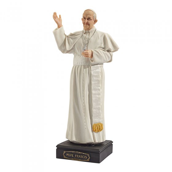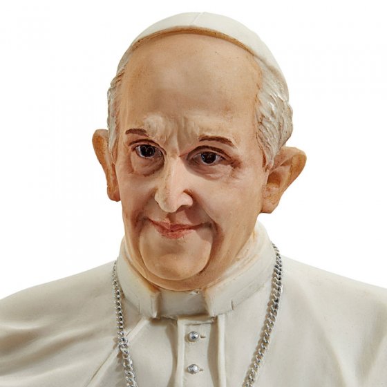 Hij staat bekend als 'de paus van de armen', omdat hij er een eenvoudige levensstijl op nahoudt en de mensen, in het bijzonder arme mensen, bezoekt: paus Franciscus I. Het leven in het paleis van het Vaticaan verwerpt hij net zo als alle pracht en praal. Dit STANDBEELD PAUS FRANCISCUS toont hem, zoals hij zich graag in het openbaar vertoont: in eenvoudige witte soutane, zonder hermelijnen cape en zonder de rode pausschoenen, de hand tot het zegenen opgeheven. De figuur is zeer gedetailleerd verwerkt en met de hand beschilderd. Materiaal: kunststeen (resine). Afm. (lxbxh): ca. 10 x 11 x 28 cm. Zorg met Pasen voor uw eigen pauselijke audiëntie!