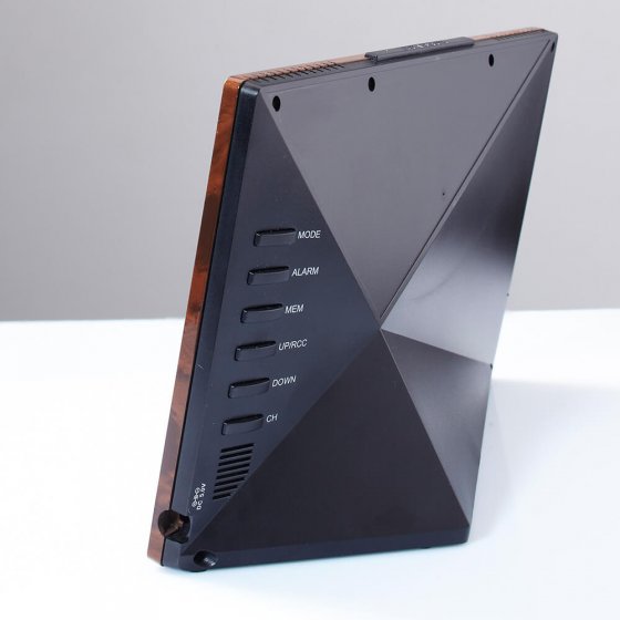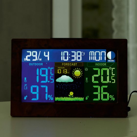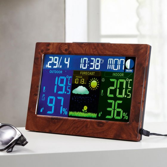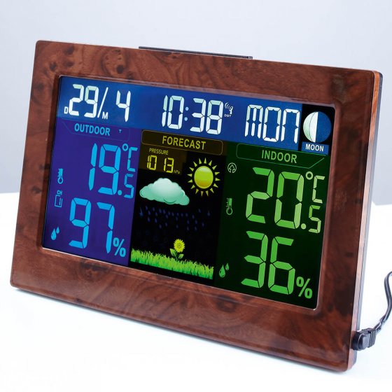 Ce qui compte en premier lieu dans une station météo numérique, c’est la fonction – mais un design raffiné en prime ne nuit pas non plus. La STATION MÉTÉO RADIO-PILOTÉE ASPECT BOIS séduit aussi bien par son grand écran en couleur et ses symboles météo que par ses données précises et son cadre large imitant le bois de loupe ! Outre l’heure exacte de l’horloge atomique et le calendrier, la station affiche la température et le degré d’humidité (intérieurs et extérieurs) et les prévisions météo. Alimentation secteur 230 V (station de base) et 2 piles AA (capteur externe). Dimensions (l x H x P) : env. 21 x 14 x 7 cm. Cette station est bien plus qu’un instrument de mesure – c’est aussi un accessoire d’intérieur moderne !