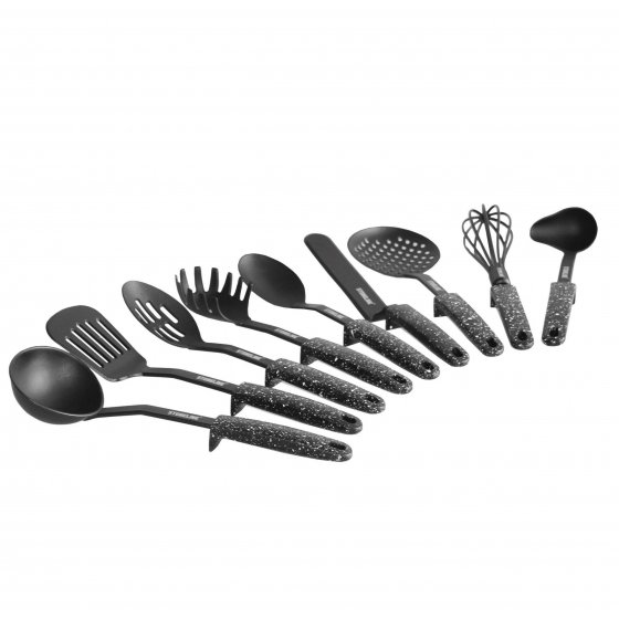 U kent dat wel: Een samenraapsel van verschillende keukenhulpjes is toch werkelijk geen fraai gezicht! En praktisch is die wanorde ook niet. Veel routineuzer gaat het koken, wanneer de hulpjes bij elkaar passen. Dat bewijst het STONELINE® KEUKENHULP-SET MET STEUNTJE iedere keer weer! Het robuuste flexibele kunststof van dit keukengerei biedt u excellente hulp – en spaart de gevoelige laag van uw kostbare pannen! Dankzij de verzwaarde handgreep met een geïntegreerde steun aan de onderzijde, raakt de kop het aanrecht niet als u het kookgerei neerlegt. Zo blijft uw aanrecht schoon! Lengte: elk ca. 30 cm. Hittebestendig tot 210 ˚C, vaatwasmachinegeschikt. Hoogwaardige kwaliteit in edele Stoneline®-optik – een praktische en mooie opwaardering van uw keuken!