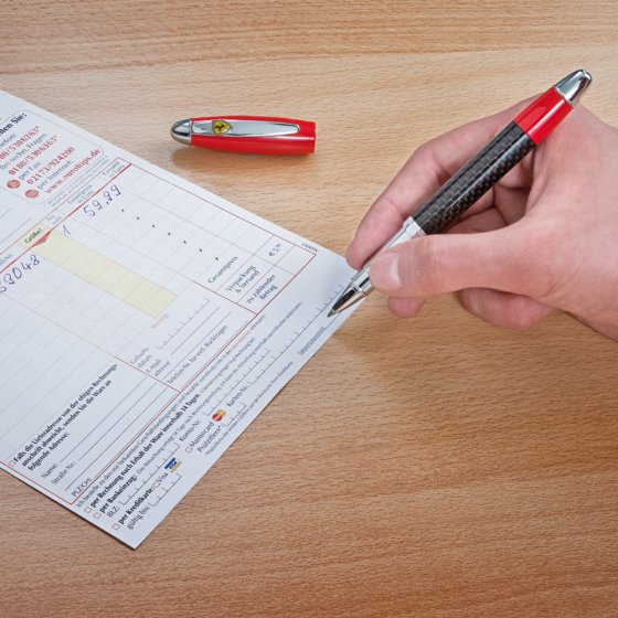 Le STYLO À BILLE “FERRARI FANGIO” a été fabriqué à la mémoire de l’un des plus grands pilotes de Grand Prix de l’histoire. Juan Manuel Fangio (*1911, †1995) franchit la ligne d’arrivée 24 fois en vainqueur ! En 1956 il se tourne vers Ferrari-Lancia. Cette saison là, il remporte 3 courses sur 6 au total et devient champion du monde avec cette écurie ! Avec ce stylo à bille original, vous allez vous aussi attirer les regards : au comptoir d’un hôtel, à la banque et à chaque fois que vous signez un document. Ce stylo en métal de grande qualité tient bien en main, tandis que les parties en carbone et le logo Ferrari sur le clip soulignent sa ligne élégante. Livré dans une superbe boîte en métal. Le cadeau idéal pour un ami cher ou pour vous même !