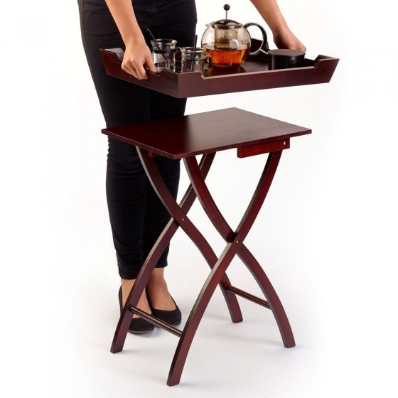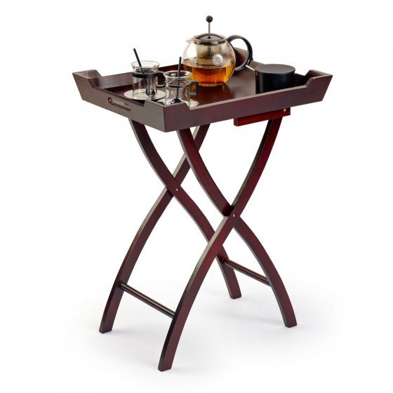 Quelle est la meilleure solution pour servir rapidement un petit café et des gâteaux sur la terrasse ou porter à un proche un plateau-repas directement au lit ? Utilisez cette TABLE DE LIT très pratique. Elle est compacte, légère et peut être placée où bon vous semble pour former un plateau d’appoint pour le support – car le plateau est parfaitement adapté à la structure. Le bord haut du plateau (avec découpes de préhension) vous permet de transporter de manière sûre les tasses, assiettes etc... Matériaux : panneau MDF?aspect acajou. Dim. : plateau env. 48 x 35 cm, hauteur de table env. 62,5 cm, surface table env. 50 x 37 cm. Constatez par vous-même, c’est beaucoup plus simple !