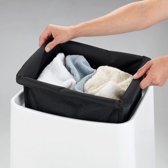 Un rangement discret pour votre linge sale et en même temps un siège confortable : le tabouret 2 en 1 est à la fois un meuble élégant et génial et un panier à linge spacieux ! Le sac amovible a une capacité impressionnante de 29 litres. Avec ses lignes incurvées et son coloris discret, cet accessoire polyvalent fait bonne figure dans n’importe quelle pièce. Matière : ABS, polyester. Dimensions (l x H x P) : 45 x 48 x 33 cm. Couleur : blanc (tabouret), noir (sac).