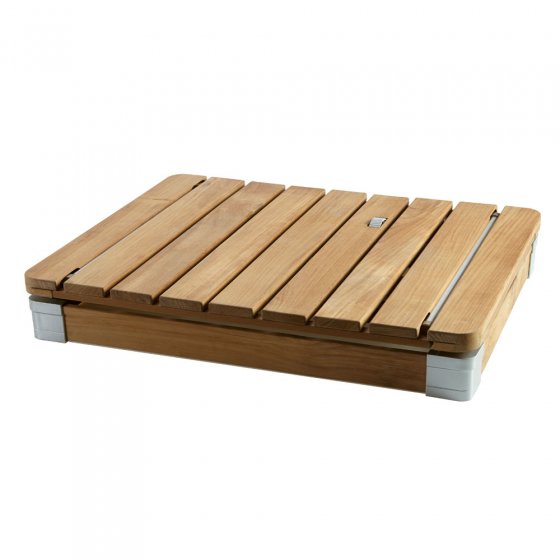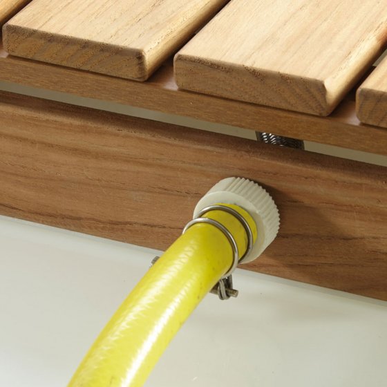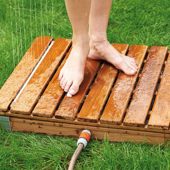 Quand il fait chaud l'été, tout ce qui rafraîchit est bienvenu. Et pour ceux qui n'ont pas de piscine dans leur jardin ou qui ne veulent pas enlaidir leur jardin avec une douche en métal, notre DOUCHE DE JARDIN EN TECK propose une alternative élégante : dès que vous posez le pied sur le sol, une vanne s'ouvre et dispense de l'eau par les 22 buses. Avec raccord de tuyau standard de ½’. Dim. (L x l x h) : env. 55 x 70 x 10 cm. Cette douche doit être placée sur une surface plane, et elle supporte une charge maximale d'env. 200 kg. Profitez d'une agréable pluie d'été rafraîchissante dans votre jardin !