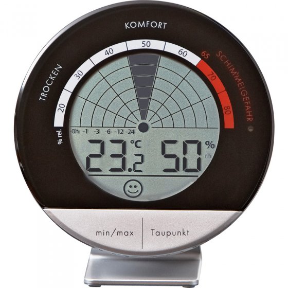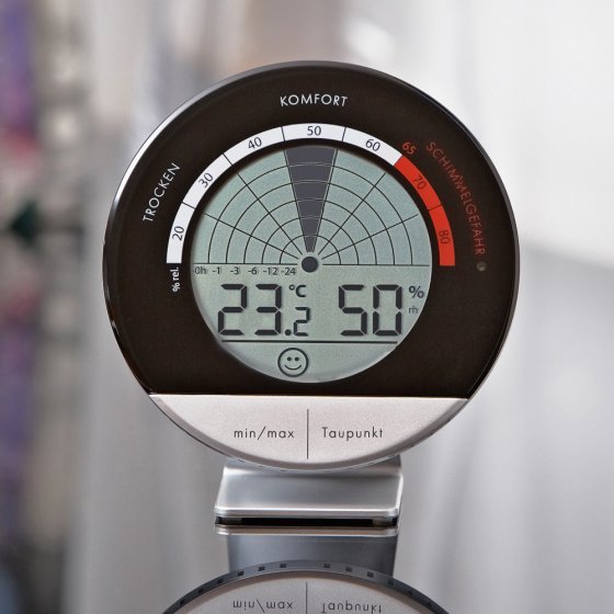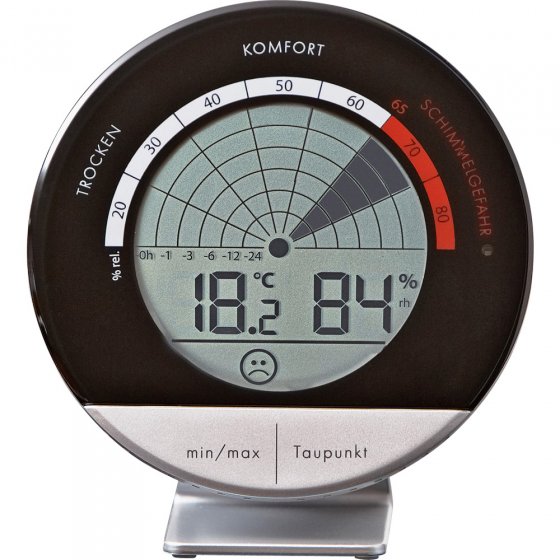 C'est prouvé : dans les pièces humides, les moisissures ont tendance à s'accumuler, et au contraire, le chauffage dessèche l'air en hiver : ces deux phénomènes présentent un réel danger pour la santé ! Pour pouvoir obtenir un climat ambiant sain par une aération et un chauffage adéquats, voici notre THERMOMÈTRE-HYGROMÈTRE AVEC DÉTECTEUR DE MOISISSURES. Son grand affichage LCD vous indique clairement la température intérieure et le taux d'humidité de l'air. Si l'humidité de l'air dépasse 65%, une alarme se déclenche pour vous avertir du danger de moisissures ! Ces données sont notamment très utiles dans une cave, un grenier ou une chambre d'amis qui ne sont pas chauffés ou aérés en permanence ! Autres performances : température maximale et minimale de la journée, température du point de condensation. S'utilise contre un mur ou sur une table, Ø env. 10 cm. Fonctionne avec 2 piles AAA (incluses). Utilisez les données que vous donne cet appareil pour préserver votre santé !