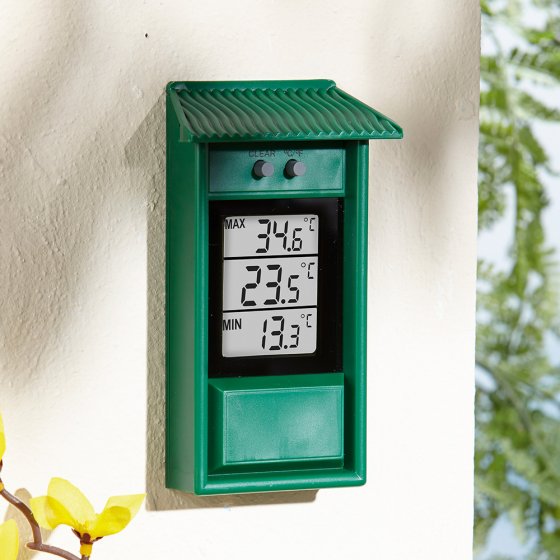 Le THERMOMÈTRE NUMÉRIQUE CABANE, qui ressemble de loin à un petit abri pour oiseaux et s'intègre donc à merveille dans un jardin ou sur un balcon, vous fournit toutes les données importantes sur la température : 1. la température actuelle, 2. la dernière température minimale mesurée, et 3. la dernière température maximale mesurée. Vous pouvez à tout moment remettre à zéro les températures minimale et maximale, la température actuelle se met à jour automatiquement toutes les dix secondes. Dimensions (H x l x P) : env. 13 x 8 x 3 cm. Écran (H x l) : env. 5 x 4 cm. Fonctionne avec 2 piles AAA (vendues séparément). Esthétique, informatif, résistant aux intempéries – voici le thermomètre d'extérieur idéal !