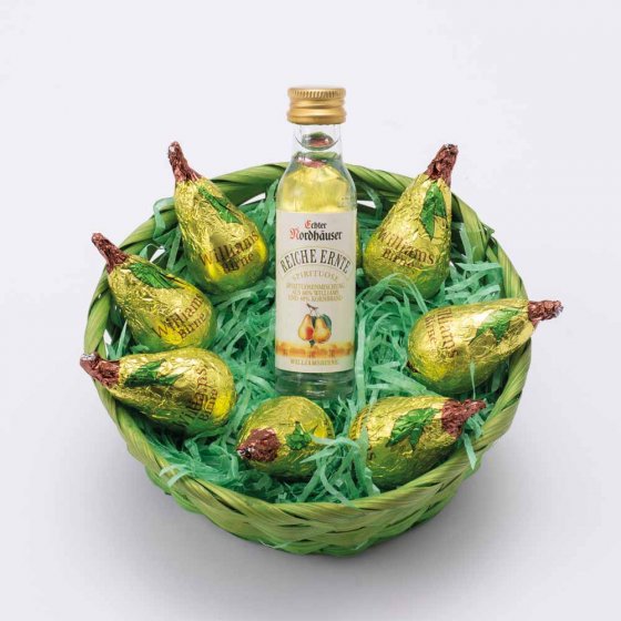 Wilt u iemand plezier cadeau doen? Met de TIPSY GOURMETMAND slaat u de nagel op de kop! Heerlijke peren van pure chocolade (ca. 125 g) met een vulling van de fijnste Williams-perenbrandewijn en een klein flesje Echter Nordhäuser Williams-perenlikeur (ca. 0,02 l, 30% vol.) verleidelijk gepresenteerd in leuk versierd bamboemandje. Afmetingen (Ø x H): ca. 15 x 4,5 cm. Bestel dit heerlijke cadeau vandaag nog - het zal gegarandeerd in de smaak vallen!