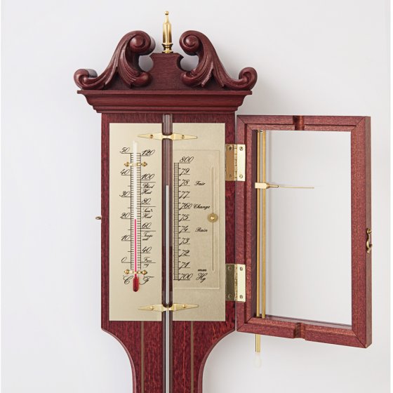 alles die hem te zien krijgen! Zeer decoratief: De zorgvuldig gemaakte behuizing gemaakt van massief beukenhout, mahonie gekleurd. Bovendien, met een klassieke, betrouwbare thermometer. Vertrouw op een nauwkeurige barometer in zijn mooiste, meest decoratieve vorm – die tegenwoordig zelden te ontdekken is!