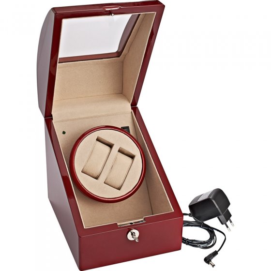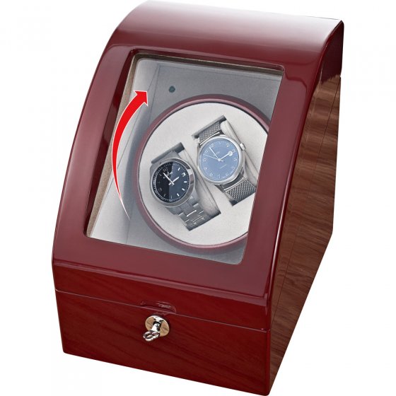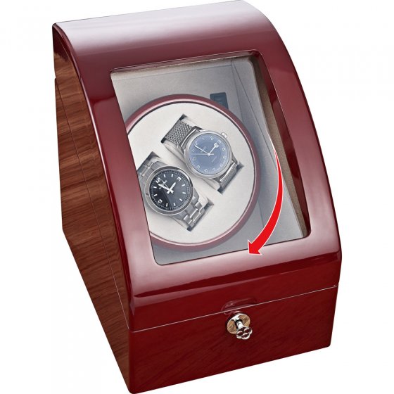 Les montres automatiques de grande qualité doivent être régulièrement actionnées pour fonctionner correctement et ne pas être endommagées par l’inaction. Ce TOURNE-MONTRES POUR 2 MONTRES fait tourner vos montres silencieusement et par une rotation lente (activation par intervalles : rotation gauche/droite pouvant être inversée) et les protège également de la poussière. Ce coffret est fabriqué en bois de grande qualité et plusieurs fois laqué, serti d’une fenêtre en verre acrylique ; il est capitonné de velours à l’intérieur. Fonctionne sur 230 V ou avec 2 piles AA vendues séparément. Dim. (L x l x h) : env. 23 x 17 x 22 cm. Offrez à vos montres un mouvement permanent !