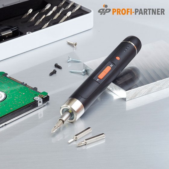 Vous avez parfois besoin de travailler avec de très petites vis – peut-être parce que vous êtes un modéliste passionné ou que vous effectuez vous-même les réparations délicates, notamment sur les lunettes et les montres ? Dans ce cas, le TOURNEVIS ÉLECTRIQUE DE PRÉCISION est l'outil qu'il vous faut ! La rotation électrique droite/gauche (inversable) permet de visser efficacement sans avoir à replacer le tournevis à chaque tour – cela vous épargne des efforts, du temps, et ménage les têtes de vis. Grâce à la lampe complémentaire, vous voyez toujours clairement ce que vous faites. Fonctionne sur batterie rechargeable par USB (câble de charge inclus). Dimensions (L x Ø) : env. 14 x 2 cm. Cet outil de Profi-Partner est un choix des plus judicieux pour serrer ou desserrer les vis les plus minuscules !
