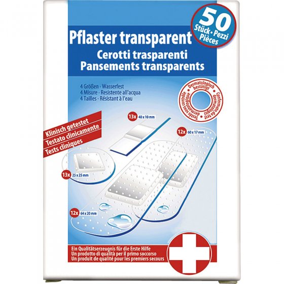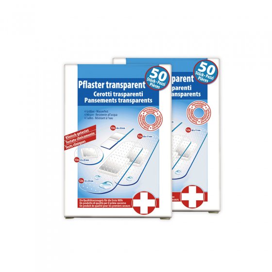 Bijna onzichtbaar, waterdicht, luchtdoorlatend en uiterst handig om wonden snel af te dekken. 100 transparante pleisters in verschillende maten, zodat u zich de moeite van het zoeken naar de schaar kunt besparen. Inhoud: 2 x 50 stuks.
