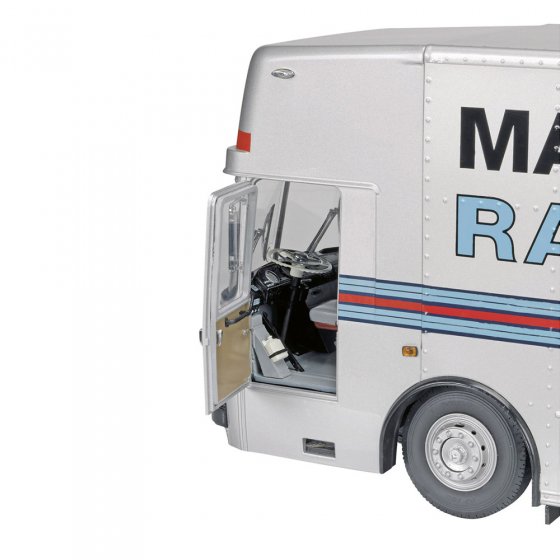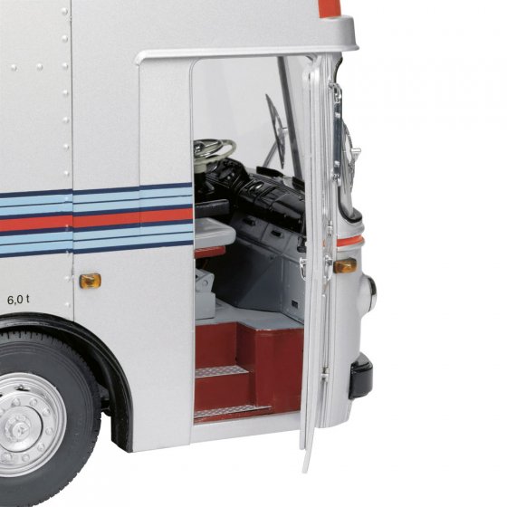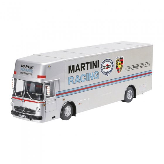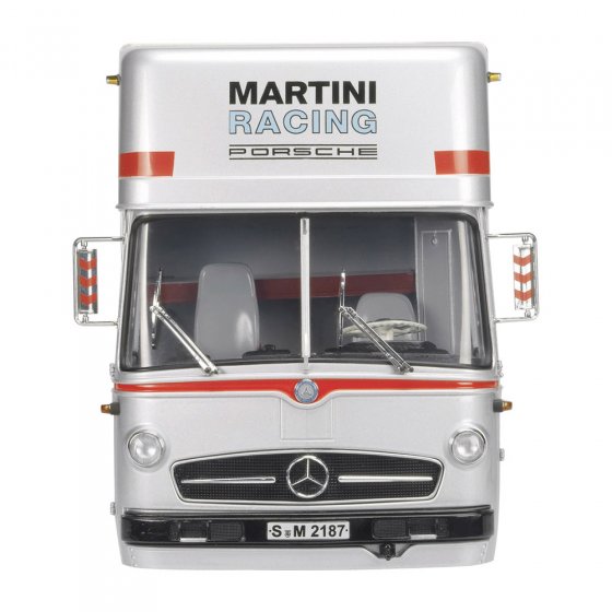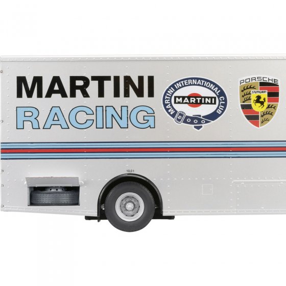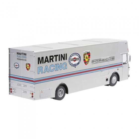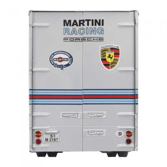 Quasiment impossible pour les fans de sports automobiles de ne pas se souvenir de la légendaire Porsche 917 qui remporta les 24h du Mans en 1971. Impossible également d’oublier le camion qui transportait ces bolides jusqu’aux circuits de course : le Mercedes Benz 0317, construit par Schenk, portait les couleurs des équipes Martini et pouvait transporter jusqu’à quatre voitures de course. Offrez-vous ce TRANSPORTEUR DE VOITURES DE COURSE « MARTINI » d’env. 70 cm de long et pesant près de 6 kg ! Tous les volets et portes s’ouvrent, les essieux sont montés sur ressort. L’essieu avant pivot. Matière : zinc moulé sous pression et pièces en plastique. Tous les collectionneurs vous envieront cette grande star des circuits de course !