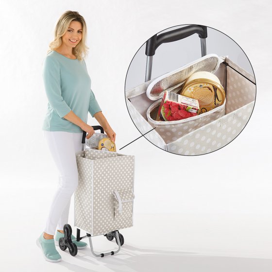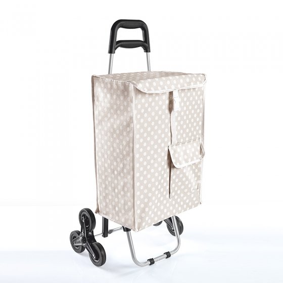 Met de traploper-shopper zijn grotere inkopen geen punt meer – want hij maakt het mogelijk lasten tot 20 kg comfortabel te vervoeren. De trolley zelf is echter een echt lichtgewicht; zijn eigen gewicht bedraagt slechts ca. 2 kg. Dankzij het 6-wiel rolsysteem kan hij zelfs gemakkelijk over trappen worden getrokken. De tas met opgestikt voorvak en parapluhouder opzij is afneembaar. Materiaal: polyester (tas) en metaal (frame). Afmetingen (hxbxd): ca. 92 x 48 x 30 cm.