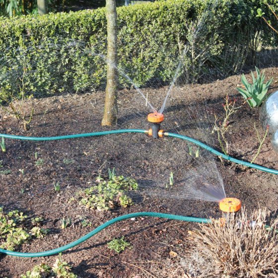 behoeften van uw planten en de grootte van uw tuin aan! Elk van de verstelbare sproeiers heeft een variabele instellingen: Voor delicate zaailingen, gras of stabiele robuuste struiken. Ontwikkel uw eigen „waterkracht“, door het aansluiten van een aantal modules: Zo bereikt u in grote tuinen alle hoeken! Veel comfortabeler dan met een slang of gieter en de bloemperken worden individueel bewaterd. Het basissysteem bestaat uit: drie stukken slang van 190 cm lengte, drie sprinklers met vijf verschillende mondstukken en een ¾-inch tap connector. Een fantastische innovatie die u toelaat om tijd, water en geld te besparen!