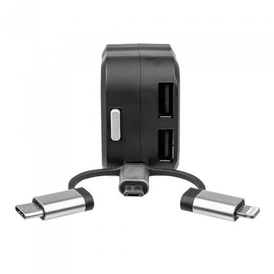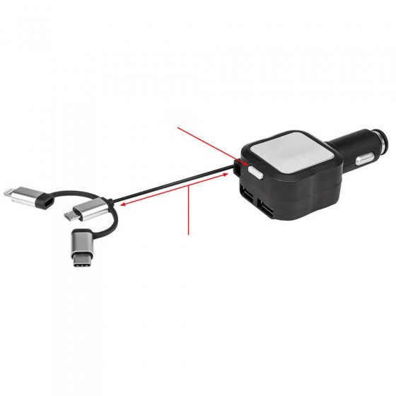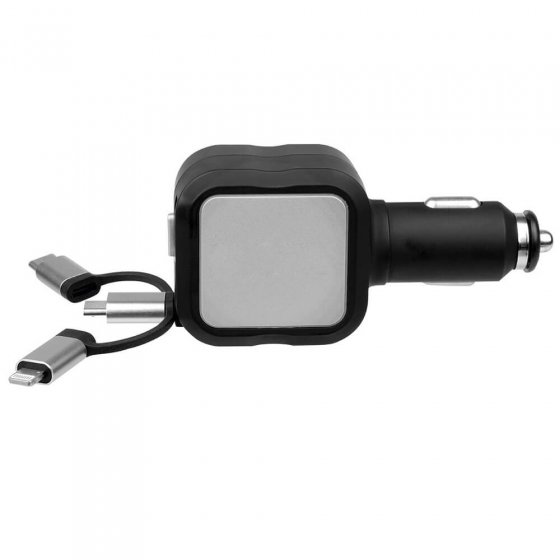 Wij hebben de perfecte oplossing voor het opladen van uw mobiele apparaten: de UITTREKBARE OPLAADKABEL VOOR IN DE AUTO verandert uw sigarettenaansteker (12 V / 24 V) in een multifunctioneel oplaadstation. De 2 USB 2.0-aansluitingen (2.1 / 1 A) en de 3-in-1-adapter voor micro-USB-B, USB-C en lightning zorgen altijd voor de juiste energietoevoer. Het adaptersnoer is comfortabel tot 80 cm uittrekbaar en rolt zich met één druk op de knop automatisch in, voor meer flexibiliteit in de auto. Afmetingen (l x b x h): ca. 12 x 4,5 x 3 cm. Nu mist u nooit meer de juiste aansluiting.
