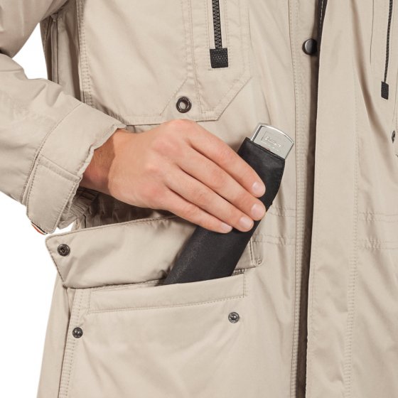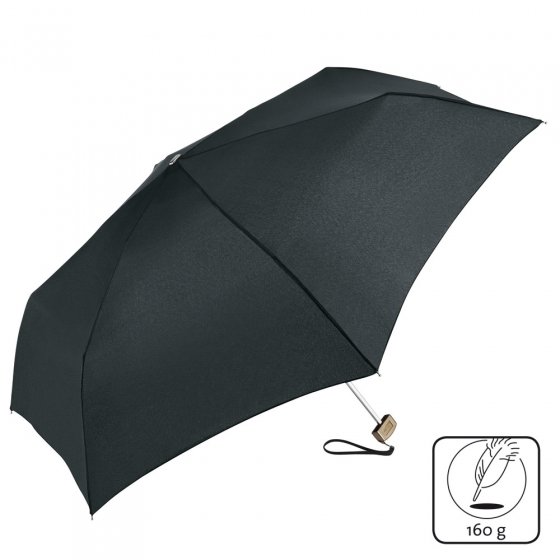 Deze ultraplatte paraplu past zonder problemen in elke binnen- of zijzak, smalle tas of aktetas - want opgevouwen is hij bij een totaal gewicht van 160 g. maar ca. 21,5 x 2,5 cm groot. Daarbij is het opbergwonder opgestoken heel royaal en beschermt met ca. 88 cm Ø heel zeker tegen regen- en sneeuwbuien. 3delig verchroomt stalen frame in een superplatte uitvoering. Stof 100% polyester extralicht. Incl. bijpassende hoes. Overtuig uzelf – zo klein kan perfecte bescherming tegen natheid van „boven“ zijn.