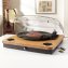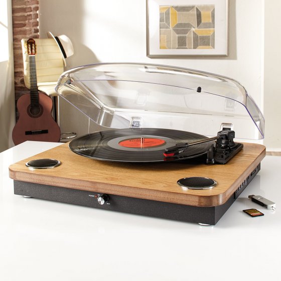 Hebt u nog grammofoonplaten thuis en wilt u graag de muziek daarop ook wel eens onderweg beluisteren of veilig bewaren voor de toekomst? Zet de muziek van uw platen dan over op een USB-stick of op een SD-kaart. Met de ruimtebesparende USB-PLATENSPELER IN RETROSTIJL, die er dankzij zijn mooie hout-look uitziet als een chique platenspeler uit de jaren 70, gaat dat heel eenvoudig. U hebt daar geen laptop of pc voor nodig. Alle opnamefuncties zijn via het paneel opzij te bedienen. Omdat het apparaat ook digitale geluidsdragers afspeelt, kunt u uw opnamen vervolgens direct beluisteren. Werkt op 230 V. Afmetingen (b x h x d): ca. 42 x 12 x 38 cm (bij gesloten kap). Digitaliseer in enkele stappen uw oude vinylschatten.