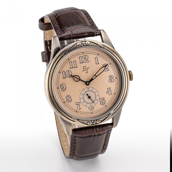 De slechts 8 mm dikke, bronskleurige, smaakvol vormgegeven kast glijdt in een handomdraai onder de mouw van elk overhemd of jasje! De opvallende gecanneleerde kroon rondt het authentieke uiterlijk perfect af. Het donkerbruine, generfde horlogebandje onderstreept de stijlvolle look en biedt een hoog draagcomfort!