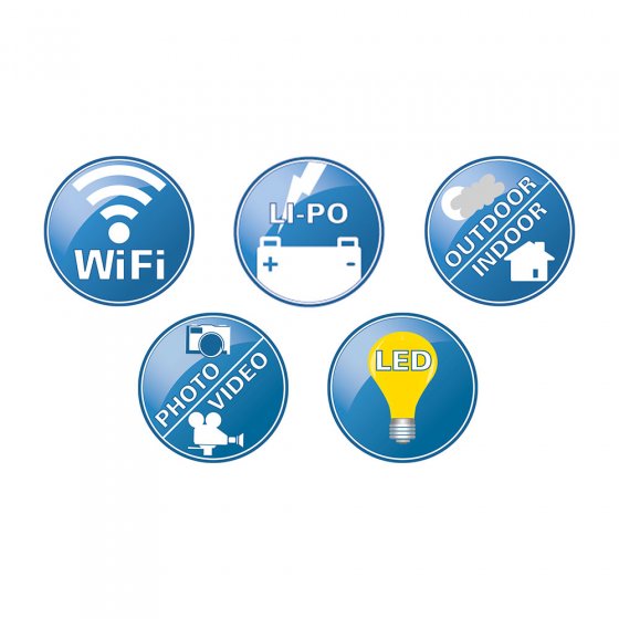 • Système de caméra FPV-WiFi pour android et iOS • Pilotage de l’engin : avant/arrière, droite/gauche, rotation sur 360° • Batterie : LiPo 3,7 V (450 mAh), durée de charge env. 120 min. • Autonomie batterie pleine : env. 20 min.