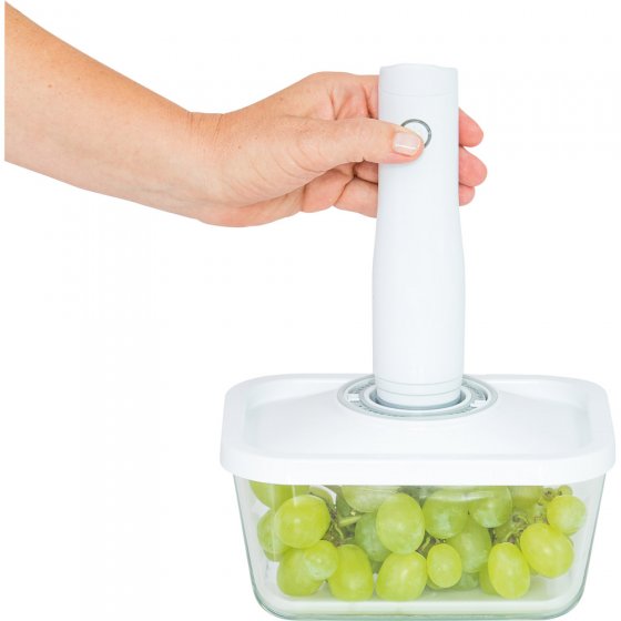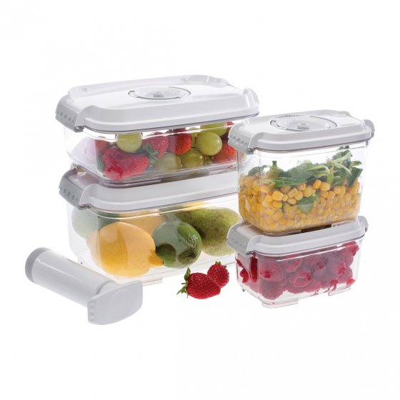 Vloeibaar of vast: met deze lucht- en waterdichte VACUÜM-VERSHOUDSET behoedt u uw levensmiddelen tegen vocht, lucht en schadelijke kiemen. Het vacumeren vermindert de oxidatie, zodat levensmiddelen tot wel 4x langer vers blijven en ook vitaminen, aroma's, mineralen en andere voedingsstoffen beter behouden blijven. Sluit gewoon de deksel van de hoogwaardige container van breukbestendig Tritan™-materiaal, plaats het meegeleverde handpompje op het dekselventiel en pomp een paar keer kort. Op deze manier heeft u uw levensmiddelen al in enkele seconden geconserveerd zonder kunstmatige conserveringsmiddelen. De siliconestop in de deksel is zelfs in niet-vacuüm getrokken toestand een lekvrije sluiting, zodat ook soepen en sauzen bewaard kunnen worden. Ook vriesbrand behoort door het vacuüm trekken tot het verleden. Ga in de toekomst dus voor vacuüm! Elektrische vacuümpomp (afzonderlijk te bestellen).