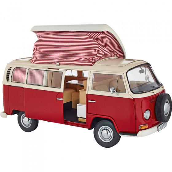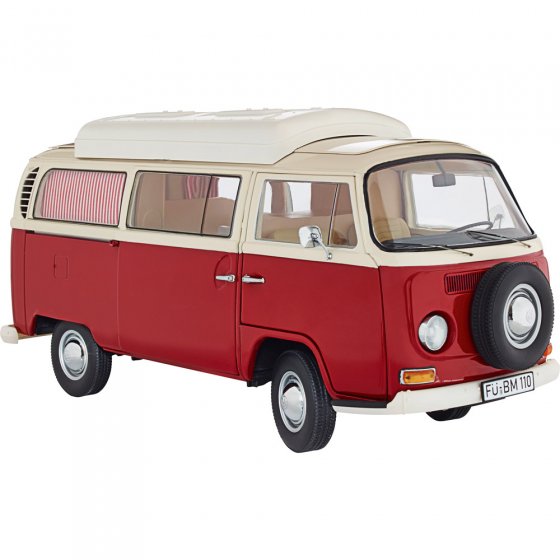 En 1967, Volkswagen présentait la deuxième génération de véhicules de transport T1. Le T2 était légèrement plus grand que son prédécesseur, ses vitres étaient plus grandes et son châssis bien mieux conçu. À l’arrière, on entendait certes encore le bourdonnement de son moteur boxer refroidi à l’air, mais ce nouveau transporteur ressemblait davantage à un van qu’à un camion. Aujourd’hui, le T2 est considéré comme l’ancêtre des "monospace" de notre époque. Le VAN VW T2 à l’échelle 1:18 vous séduira par sa fonctionnalité : tout ce qui s’ouvrait sur l’original s’ouvre également sur le modèleréduit : du toit surélevé au capot moteur. Et bien entendu, la porte sur le côté est coulissante et l’essieu avant est mobile. L’intérieur est équipé de tout le nécessaire de camping, y compris de rideaux rayés aux fenêtres. Ce modèle-réduit est fabriqué en zinc moulé, les autres pièces sont en plastique. Ce "studio" automobile qui transforma les petites familles en grands voyageurs et les adaptes des voyages en globe- rotteurs est indispensable à toute collection digne de ce nom ! Réservez votre exemplaire sans plus attendre !