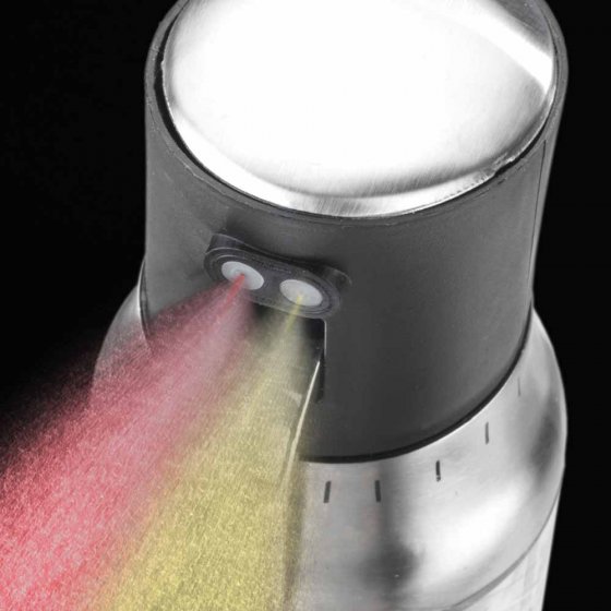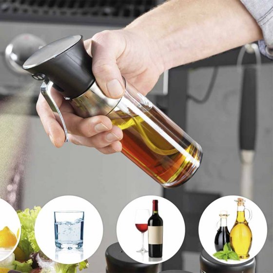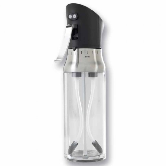Vous avez horreur des salades noyées dans leur sauce, des tapas imbibées d’huile, et des steaks trop marinés ? Avec le VAPORISATEUR DOUBLE COMPARTIMENT vous pouvez doser avec précision la quantité de liquide nécessaire pour les plats, et vous pouvez même mélanger 2 liquides ! Huile et vinaigre, huile et balsamico, ou vin blanc et jus de citron : il suffit de remplir les compartiments avec le liquide désiré et d’actionner le levier vaporisateur. Le dosage du mélange est ajustable en continu par le bouton rotatif. Capacité max. par cylindre : env. 100 ml. Dimensions (H x l x P) : env. 20 x 9 x 6 cm. Un bon tuyau : le vaporisateur n’est pas seulement très pratique dans la cuisine, mais aussi au barbecue !