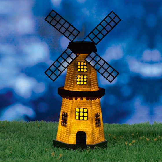 Suchen Sie noch nach einem reizvollen Hingucker für Ihren Garten, Ihren Balkon oder Ihre Terrasse? Die BELEUCHTETE SOLAR-WINDMÜHLE sieht toll aus und passt in jede Umgebung. Eine LED im Inneren der Mühle sorgt in Kombination mit dem Solar-Panel auf dem Dach nebst Akku und Tageslichtsensor für eine sanfte Illuminierung nach Einbruch der Dunkelheit (Leuchtdauer bis zu 8 Stunden.) Die Flügel sind selbstverständlich drehbar; schon ein leiser Windhauch setzt sie in Bewegung. Jedes Exemplar ist handbemalt. Maße (L x B x H): ca. 13 x 12 x 34 cm (mit Flügeln). Setzen Sie in Ihrem Garten oder auf Ihrem Balkon einen leuchtenden Gestaltungsakzent!