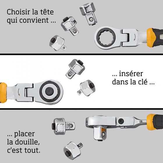 “Bon compromis entre les clés à cliquet de 3/8" ( trop petites) et de 1/4" (souvent trop grosses) qui permet l'utilisation de toutes les douilles. Manche orientable pratique.”