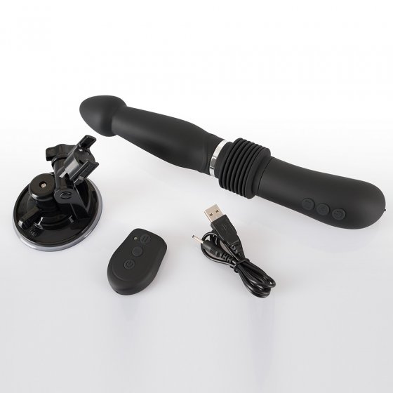 Deze vibrator maakt indruk met zijn diepe stoten tot 6 cm in 3 instelbare snelheden. Het zachte oppervlak en de stimulerende vorm glijden als vanzelf naar binnen. Een afneembare en verstelbare zuignap maakt handsfree gebruik mogelijk. De meegeleverde afstandsbediening is, net als de vibrator zelf, oplaadbaar met de meegeleverde USB-oplaadkabel. Totale lengte 30,3-36,3 cm, insteeklengte 15 cm, Ø 4,2 cm. Silicone, PU, ABS.