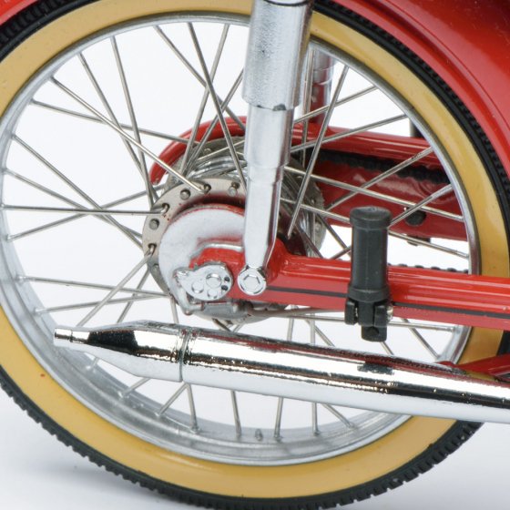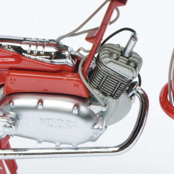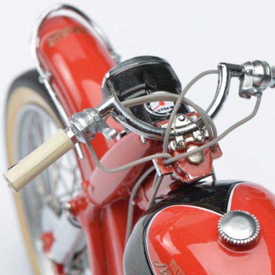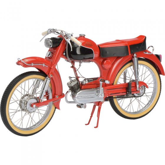 Les mobylettes de la série "Avanti", fabriquées en 1956 par le spécialiste des deux-roues de Nuremberg, Victoria, arborent fièrement un côté résolument sportif : un guidon court et léger, une suspension ferme et un ensemble siège-réservoir rehaussé. Elles avaient tout pour concurrencer les mobylettes italiennes sportives de l’époque, malgré leur tout petit moteur de 47 cm3. Et ce n’est pas par hasard si leur modèle-réduit a également adopté un nom à consonance italienne : "Avanti". Le modèle-réduit VICTORIA-AVANTI, à l’échelle 1:10 est une reproduction quasi parfaite de l’original. Il vous séduira par ses suspensions tout à fait fonctionnelles, par ses roues qui tournent à rayons métalliques et par son laquage ultra brillant authentique. Ce modèle-réduit est fait de plus de 100 pièces en zinc moulé sous pression et pièces en plastique. La plus italienne de toutes les mobylettes allemandes d’après-guerre est un must de toute collection digne de ce nom !
