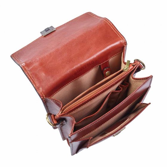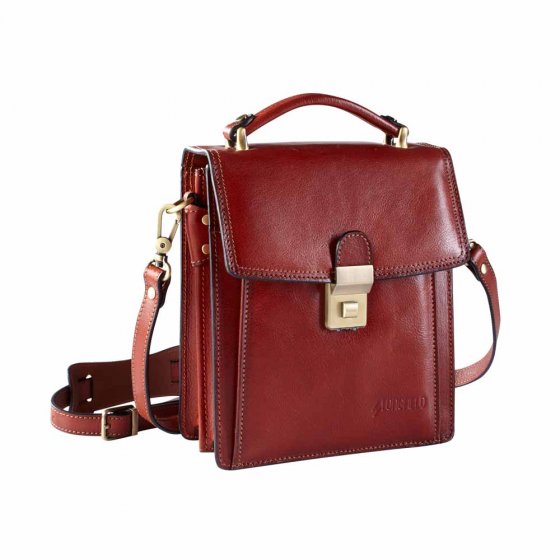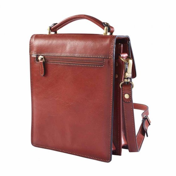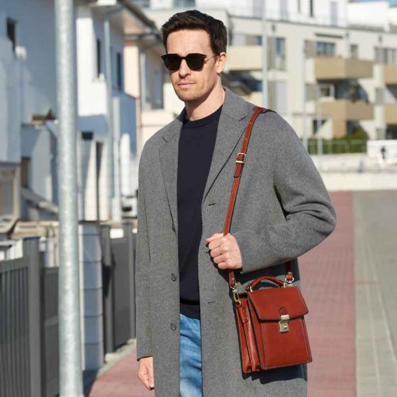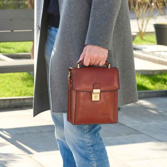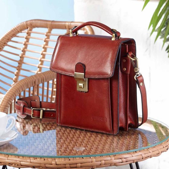 Deze VINTAGE TAS VAN ITALIAANS LEER wilt u op elke reis meenemen, al was het alleen maar vanwege zijn look: de klassieke uitstraling met de opvallende gepolijste metalen onderdelen (zinklegering) en het hoogwaardige vakmanschap getuigen van een goede smaak. Hij is ook praktisch: ten eerste is hij ruim genoeg om er comfortabel een 9,7" tablet in kwijt te kunnen en ten tweede heeft hij twee grote vakken, twee ritsvakken en een buitenvak aan de voorkant. Hij kan zowel in de hand als elegant over de schouder worden gedragen, dankzij een afneembare riem met schouderpad. Afmetingen (b x h x d): ca. 20 x 28 x 9 cm. U zult dol zijn op deze tas!