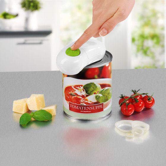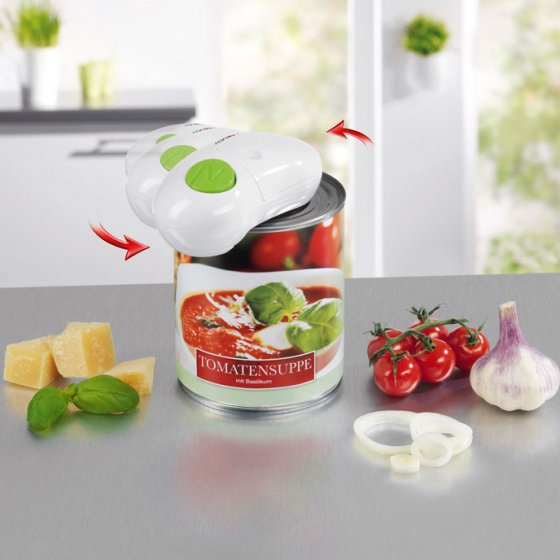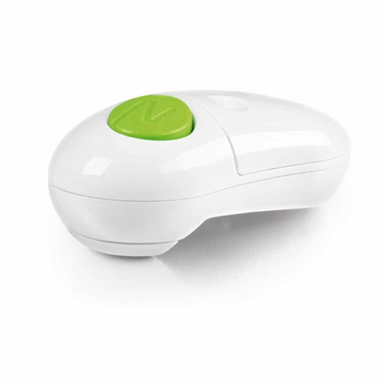 Het openen van blikjes kan vermoeiend en soms zelfs gevaarlijk zijn. Deze volautomatische blikopener doet het werk voor u, houdt het automatisch verwijderde deksel magnetisch vast en voorkomt het ontstaan van scherpe randen. Werkt op 2 AA-batterijen (apart te bestellen). Eenvoudig te reinigen dankzij de afneembare mesafdekking. Past op de meeste ronde, vierkante en ovale blikken. Afmetingen (l x b x h): 12 x 7 x 4 cm. Kleur: wit, groen.