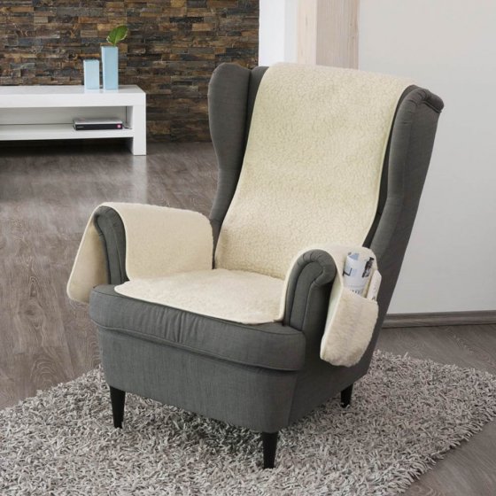Is uw fauteuil wel lekker comfortabel, maar mag deze wel wat zachter zijn? Of heeft de fauteuil een leren bekleding, die soms wat koel aanvoelt? Met deze SCHEERWOLLEN FAUTEUILBESCHERMER maakt u uw fauteuil direct superzacht! Scheerwol is al eeuwenlang geliefd als textielmateriaal, en dat heeft een reden: scheerwol is zacht, temperatuurnivellerend en vuilwerend. De pool van deze fauteuilbeschermer is uitgevoerd in wolmerkkwaliteit, daardoor zijn zuiverheid, een hoge scheurvastheid en kleurechtheid gegarandeerd. In de praktische vakken opzij kunt u uw bril, de afstandsbediening of de krant kwijt. Afmetingen (l x b): zitkussen ca. 160 x 50 cm, armleuningbeschermer ca. 60 x 40 cm. Kom heerlijk tot rust!